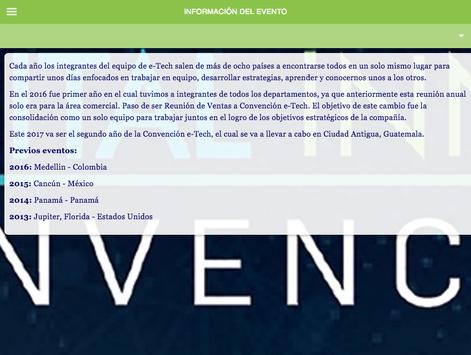 App de la Digital Innovation Convención 2017 que se realizará en Antigua (Guatemala) del 11 - 15 de julio. En ella todos los asistentes pertenecientes al equipo e-Tech podrán consultar la información y horarios a lo largo de la convención. Además de recibir notificaciones en tiempo real con toda la información de las ponencias y actividades que se estarán llevando a cabo durante la convención.