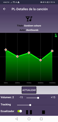Para cada canción puede configurar el volumen de audio ad hoc. Por ejemplo, si una canción grabada con un nivel demasiado bajo o demasiado alto se incluye en su lista de reproducción, se puede reproducir con un pequeño aumento o disminución de volumen en comparación con la básica, configurada en su dispositivo.