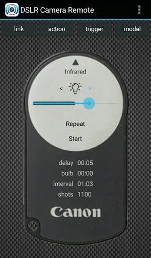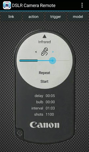 - infrared control of Canon, Nikon, Sony, Pentax, Olympus, Minolta and Fuji camera (if your phone has an IR blaster and with Lollipop or above Android version)
