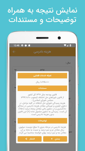 Calcular el costo de la fiscalía y los aranceles de los servicios judiciales se separa de diferentes etapas y secciones de los procedimientos, ya sea primitivo, rechazo, apelación, rechazo y protesta de terceros, y financieros, no- Financiero, Check (Criminal), Mehri (Monedas) y otros servicios judiciales con la posibilidad de elegir un Consejo de Resolución de Disputas como referencia competente