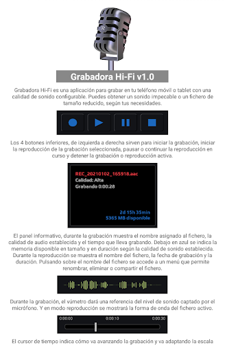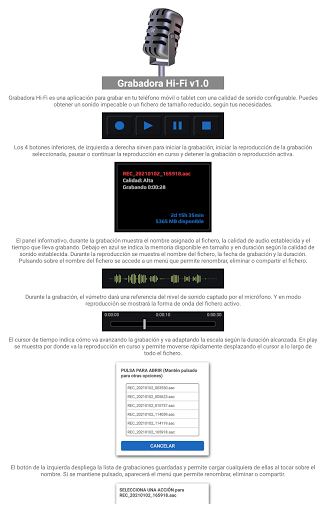 Grabadora Hi-Fi es una aplicación para grabar en tu teléfono móvil o tablet con una calidad de sonido configurable. Puedes obtener un sonido impecable o un fichero de tamaño reducido, según tus necesidades.