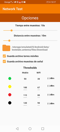 Configure las opciones que mejor se ajusten: distancia mínima entre muestras de señal (y/o tiempo mínimo), niveles de señal para colorear los resultados de la señal en el mapa (negro, rojo, amarillo y verde) o la posibilidad de guardar solo las torres y no las muestras para reducir el espacio en disco.