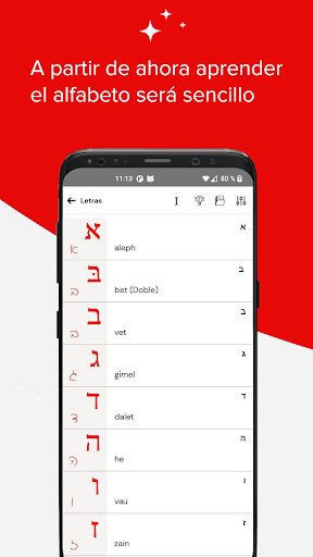- La aplicación contiene la traducción del hebreo al español, la transcripción en español y la palabra en hebreo.