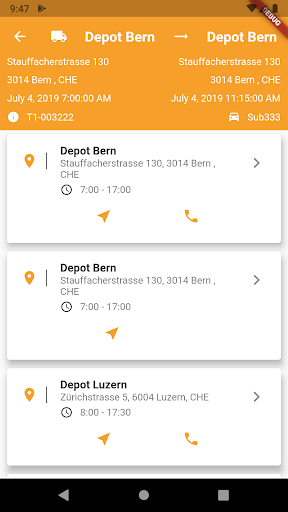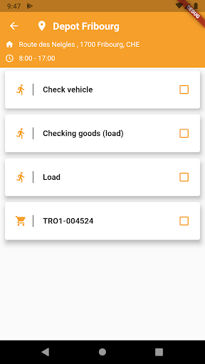 Los datos de orden y recorrido se envían automáticamente del sistema de gestión de transporte de Capcargo TMS al vehículo y viceversa.Con el dispositivo móvil, que está desconectado, todas las actividades relevantes son compatibles con todas las actividades:Horario de apertura o detalles de contacto