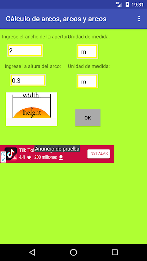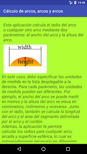 Esta aplicación calcula el radio del arco o cualquier otro arco en dos dimensiones: el ancho del arco y la altura del arco. Es necesario especificar las unidades de medida en la lista desplegable. Para cada parámetro, las unidades de medida pueden ser diferentes. Por ejemplo, el ancho del arco se puede medir en metros y la altura del arco se eleva en centímetros, milímetros y viceversa. Junto con el radio, también se calculan la longitud del arco y el área de la figura formada por el arco y el acorde.