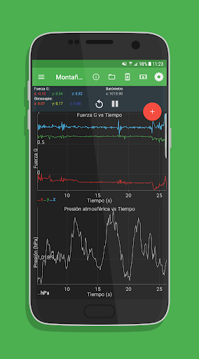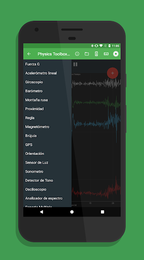 Un menú permite al usuario visualizar y registrar datos de los siguientes sensores (dependiendo de las capacidades del dispositivo móvil del usuario):