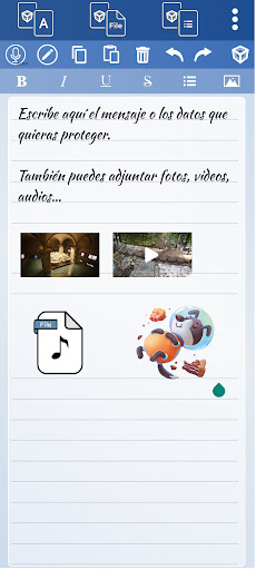 - Creación de archivos encriptados, donde puedes escribir mensajes de textos y adjuntar archivos (fotos, videos, audios) para estar protegidos con la contraseña que tú decidas.