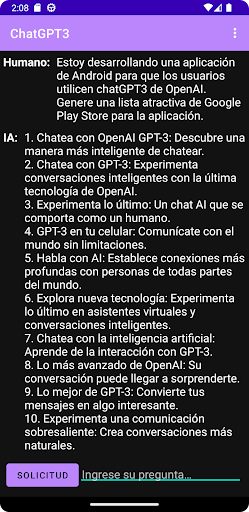 Humano: Estoy desarrollando una aplicación de Android para que los usuarios utilicen chatGPT3 de OpenAI. Genere una lista atractiva de Google Play Store para la aplicación.
