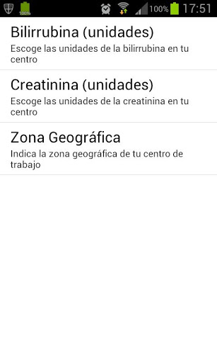- Pantalla de Ajustes para configurar las unidades de la bilirrubina y creatinina, y la zona geográfica. Para acceder, pulsa "menu" en tu teléfono.