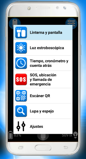 Linterna y Pantalla, Luz estroboscópica, Tiempo/Cronómetro, SOS, Escáner QR, Lupa y Espejo.