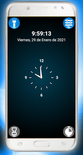 Muestra la fecha y la hora en un reloj digital y analógico. Además, incluye cronometro, cuenta atrás y temporizador de luz.
