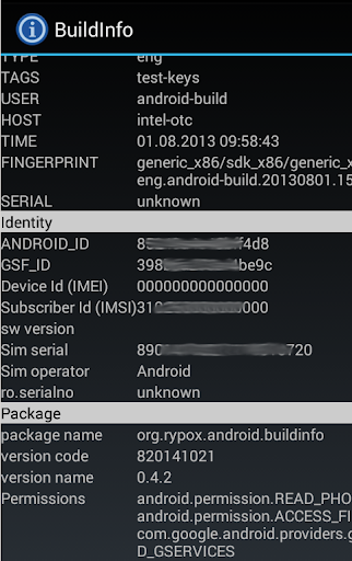 Added since version 0.4.2 was Identity group, it shows Android Id, Device Id, GSF Id (Google Services Framework), IMEI, IMSI and SIM serial.