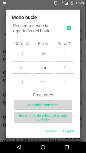 - Loop: tocar cualquier conjunto de compases de la pieza repetidamente