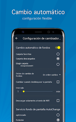 La aplicación tiene una función de cambiador automático de fondo de pantalla. Fuente e intervalo de actualización de HD fondos puede elegir usted mismo. Simplemente ponga papel pintado a sus favoritos, seleccione la opción correspondiente en la configuración y disfrute.