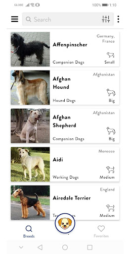 - Vast Base de datos: la aplicación contiene datos de más de seis cien razas de perros en el mundo. Además, también incluye datos de las razas cruzadas más populares, por lo que apenas hay un perro en el mundo que no se puede identificar utilizando la aplicación.