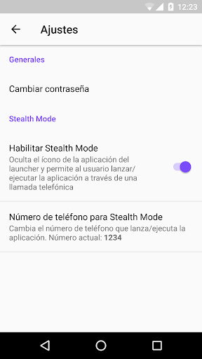 * Stealth Mode: Oculta el icono de la aplicación y ejecútala/lánzala haciendo una llamada telefónica.
