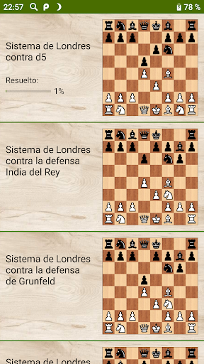 Los acertijos se dividen en 4 grupos dependiendo de qué tan negro esté tratando de luchar contra el sistema de Londres. En todos los juegos de esta aplicación, la victoria la lograron los ajedrecistas que jugaron con piezas blancas.