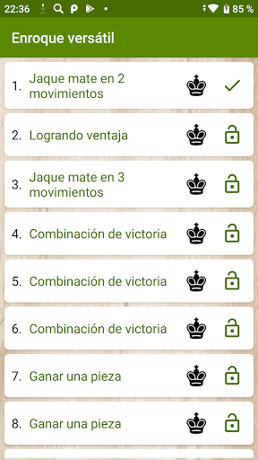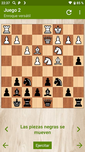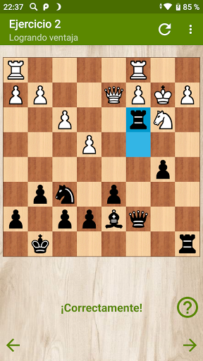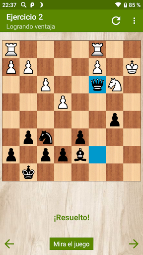 La versión gratuita contiene 27 ejercicios interesantes sobre combinaciones de victoria, ganar ventaja, ganar piezas y emparejar en unos pocos movimientos. En la versión completa de la aplicación, 172 tareas te esperan.