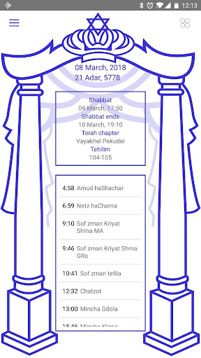 La aplicación tiene un calendario judío con Zmanim, una brújula para determinar la dirección de la oración, Tehilim con la división en días mes y semana, Torá dividida por capítulos semanales y otras oraciones y bendiciones diversas.Hay un libro de oración-Siddur dividido en tres opciones, Alakhot, Sgulot.Donde quiera que esté allí siempre habrá una oportunidad para leer el diario Tehilim, para estudiar el capítulo necesario de la Torá, lea la oración & "Tikun aklali"y generalmente ore y contactar a Dios en cualquier momento.