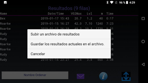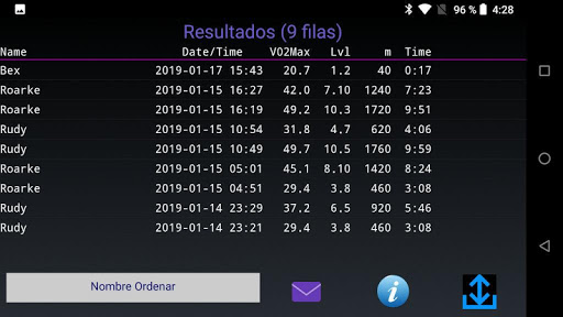 - Ordenar resultados. Por nombre, VO2Max o fecha