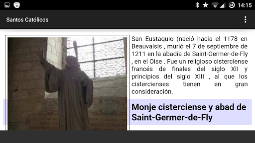 Cada Santo tiene su historia y obra. En la mayoría se incluye una ilustración, estatua, cuadro o fotografía del Santo, así como también otros datos accesorios.