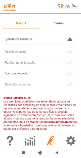 La aplicación dispone de dos listados de ejercicios, básicos y avanzados. Los ejercicios básicos los puedes realizar en el mismo puesto de trabajo mientras que los avanzados son ejercicios para realizar con cierta intimidad.