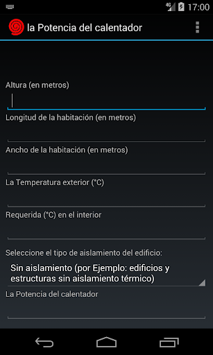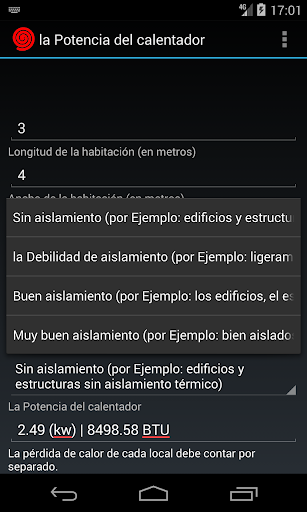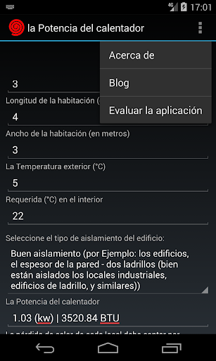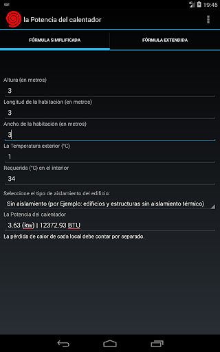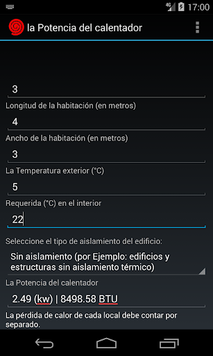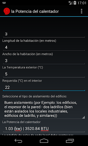 La aplicación le ayudará a calcular la potencia del calentador, necesaria para la calefacción de locales, teniendo en cuenta deseada de la diferencia de temperatura por la fórmula: V x T x k = kcal/h, donde: