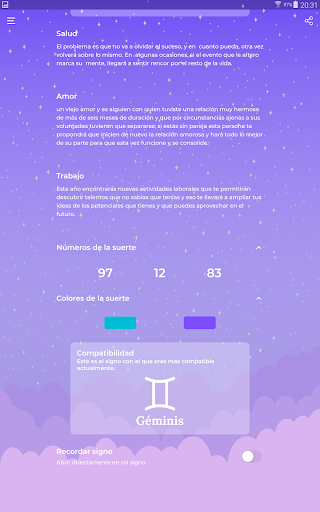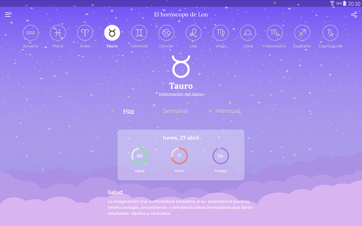 Accede a tu horóscopo desde tu dispositivo. Esta aplicación proporciona horóscopo diario, semanal y mensual. Disponible gratuitamente.