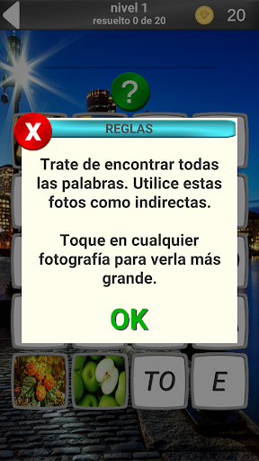 Atención!!! ¡Actualizar la versión 1.0.5 a la versión 1.0.6 perderá el progreso del juego!!!! En la versión 1.0.6, agregamos recompensas por ver anuncios, reescribimos la lógica del juego y actualizamos los gráficos.En este juego hay 620 palabras y tantas imágenes. Tienes que adivinar la palabra que se muestra en la imagen. Las palabras se usan principalmente en la vida cotidiana, pero también hay tales que se encuentran muy raramente en la conversación diaria. Su tarea es adivinar la palabra que se muestra en la imagen. El juego promueve el desarrollo del pensamiento lógico. Disfrute de sus vacaciones.