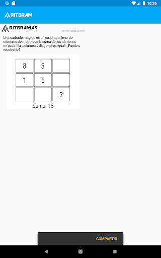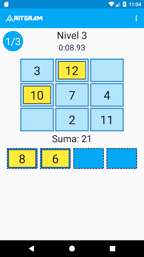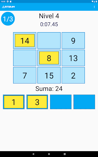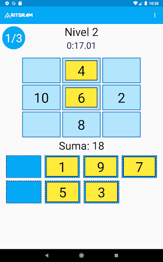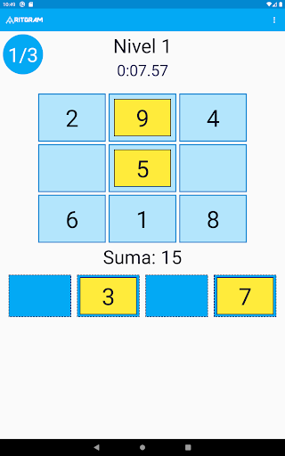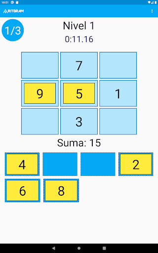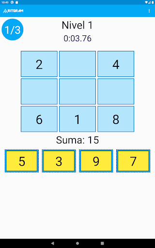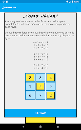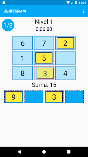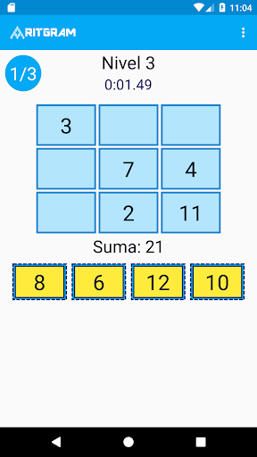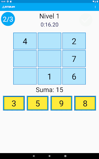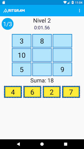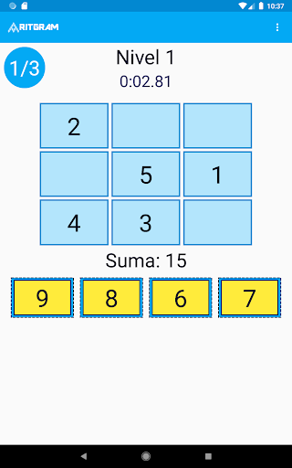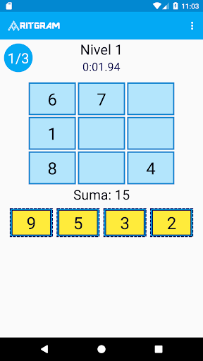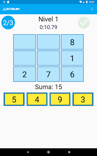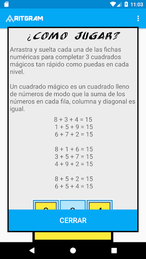 En un cuadrado mágico la suma de los números de cada renglón, cada columna y cada diagonal es siempre la misma cantidad. Completa 3 cuadrados mágicos lo mas rápido que puedas para cada nivel. Este juego contiene una amplia variedad de niveles desde principiantes hasta genios en las matemáticas.