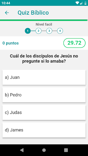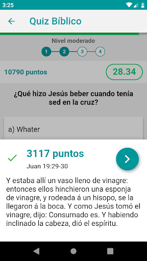 Las preguntas aparecerán automáticamente y tendrá 30 segundos para seleccionar la respuesta que considere correcta. Pronto aparecerá si lo has entendido bien o mal, junto con el versículo de la Biblia que contiene la respuesta correcta.