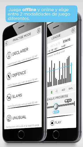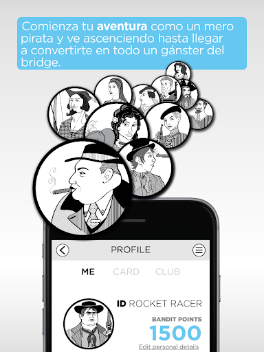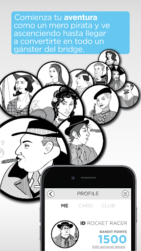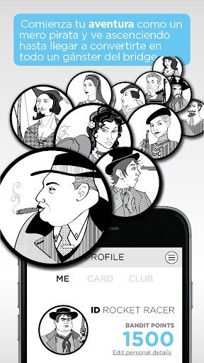 Elige tu modalidad de juego entre la Liga Semanal, en la que tus resultados son directamente comparados con otros jugadores de nivel similar, o un rápido Blitz (ráfaga) en la que jugarás 3 manos al azar y la combinación de tus tres resultados es la que se tendrá en cuenta para la clasificación diaría. Con independencia de tu nivel de juego, puedes empezar a acumular "Bandit Points" con los logros que vayas consiguiendo y podrás desbloquear nuevos personajes y avatares. Comenzarás tu carrera de bandido del bridge como un mero pirata y tendrás que emplearte a fondo para convertirte en el ¡Al Capone del brigde!
