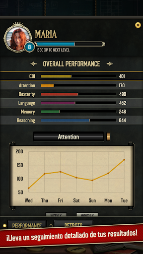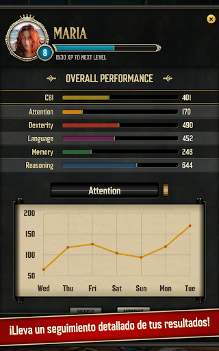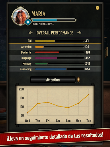 • Consulta los gráficos semanales y mensuales con estadísticas detalladas acerca de tu rendimiento en memoria, atención, destreza, habilidades lingüísticas y razonamiento.
