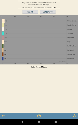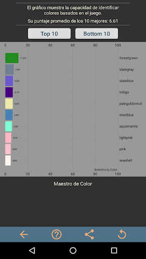 El menú 'Estadísticas' muestra el puntaje de percepción de color acumulado del usuario, que se basa en el juego del usuario.