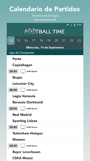 Tiene los horarios oficiales de las principales ligas mundiales, entre ellas la Liga Española, Premier League, Serie A, etc..