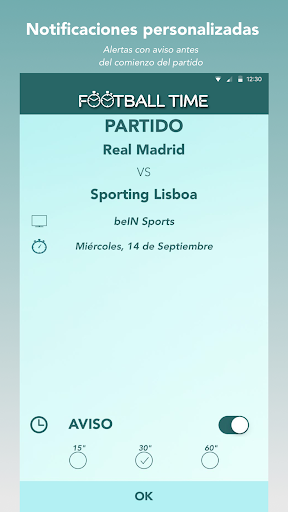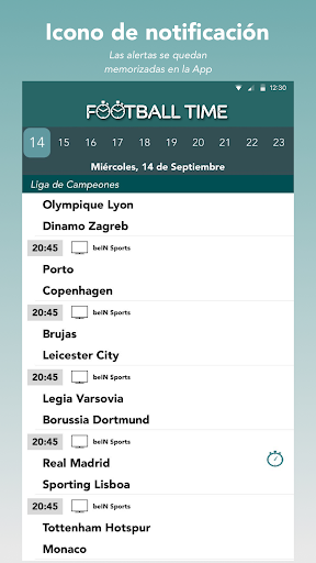 Futbol tv hace todo el trabajo por ti, simplemente dile con que tiempo de antelación quieres que te avise del partido que te interesa y la app se encargará de avisarte para que no te pierdas ningún partido de fútbol.