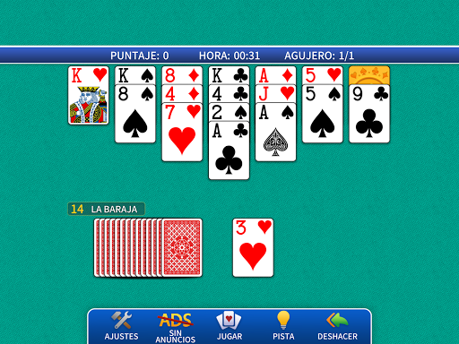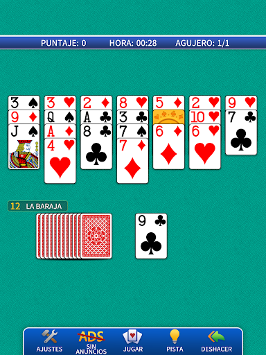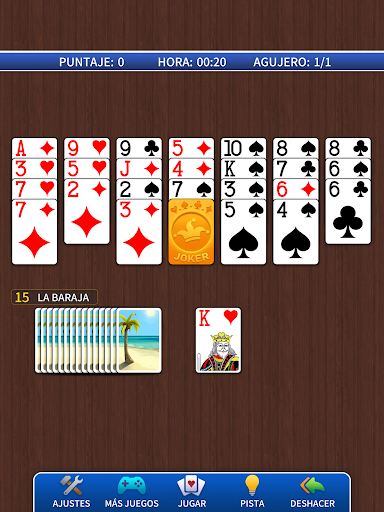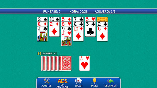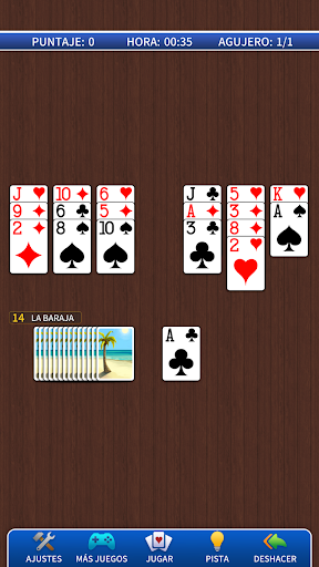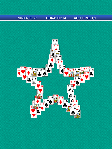 Golf es uno de los solitarios más jugados en el mundo. El objetivo del juego es completar un campo de golf compuesto de uno, nueve o dieciocho "hoyos". Cada "hoyo" es un panel de 7 columnas con 5 cartas repartidas en cada una, todas bocarriba. Una carta adicional se reparte como base del montón. Las restantes 16 cartas se colocan bocabajo para formar la reserva y tus "golpes". Para ganar un hoyo necesitas pasar todas las cartas de la mesa al montón usando el menor número de golpes posible como en el juego de golf de la vida real. Las cartas se juegan en secuencia de la menor a la mayor o de la mayor a la menor, independientemente del tipo y color, no se requiere arrastrar y mover el montón de cartas. Juega todo el tiempo que quieras, sin bloqueos, sin restricciones. Prueba tus habilidades, puntúa lo mejor posible, mantente en lo alto de las clasificaciones y consigue logros y comparte tus resultados con amigos. El Golf Solitare es fácil de aprender, pero difícil de dominar.