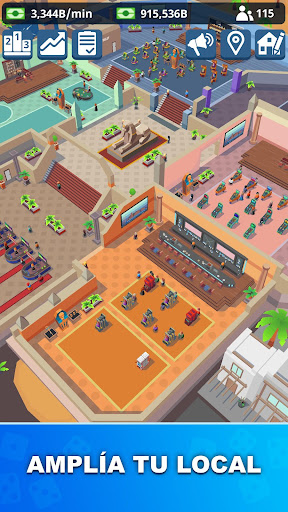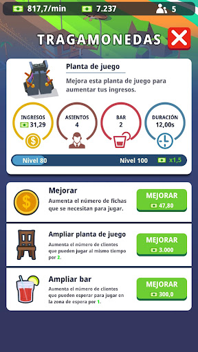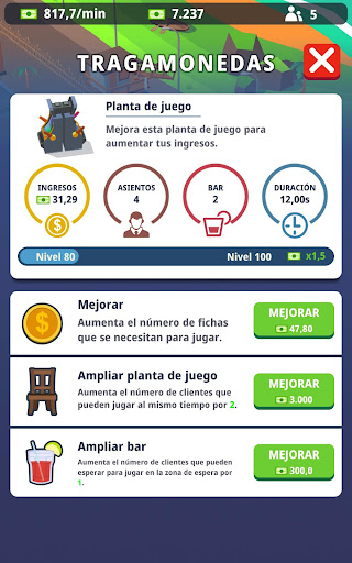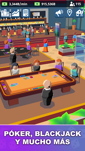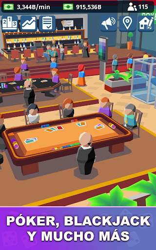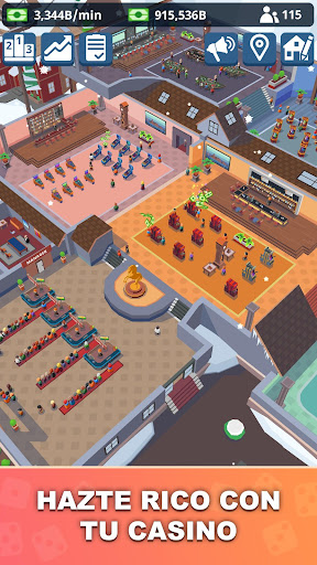 Gestiona el bar de cócteles y el mostrador de cambio sabiamente para ganar dinero. Amplía el casino con nuevas plantas y desbloquea las máquinas y los juegos más alucinantes.