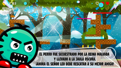 El perro pobrecito, el mejor amigo de Leo, fue secuestrado por la reina malvada y llevado a la jaula oscura. ¡Ahora el señor Leo tiene una tarea muy dura - rescatar a su mejor amigo! El Sr. Leo tiene que a la reina para pasar el nivel completamente▸ ▸ ▸ ¡Cuidado! Muchos enemigos, problemas, obstáculos y trampas te esperan en el camino a través de diferentes terrenos y los mundos maravillosos.