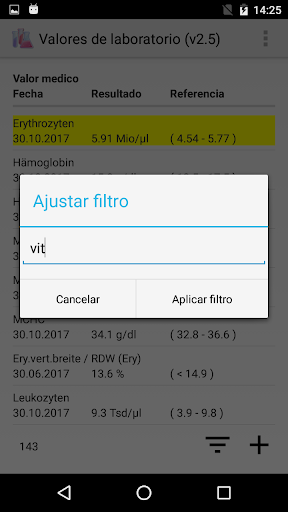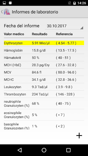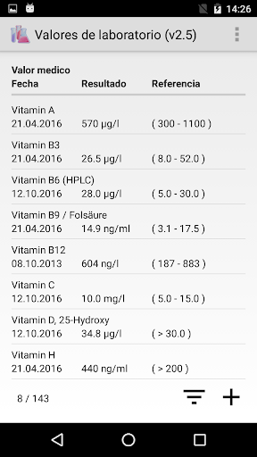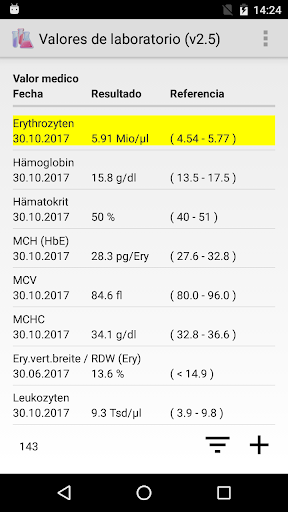 Aproximadamente 140 de los valores medicos de laboratorio medidos con mayor frecuencia (por ejemplo, eritrocitos, hemoglobina, colesterol, HbA1c, ferritina, sodio, potasio, creatinina, TSH, ...) ya se han incluido en la aplicación. Los valores medicos pueden ser cambiados y complementados. Si otros zonas de referencia son aplicables en su caso, estos también pueden ser modificados.