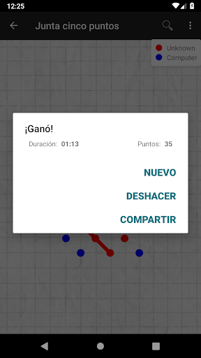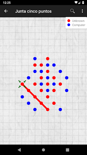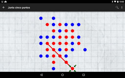 Sea el primero en juntar cinco puntos en la forma de una línea recta de modo horizontal, vertical o diagonal. El Android posiciona los azules, mientras Usted los puntos rojos. A los puntos de ambos colores los meten en turno sobre las intersecciones de las líneas. Su turno es inicial.