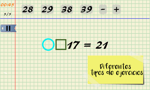 El siguiente tipo de ecuaciones están disponibles para niños de la escuela primaria: comparacion, adición o sustracción de números entre 0 y 10; o ecuaciones con números entre 10 y 20 y algunos van hasta 100.