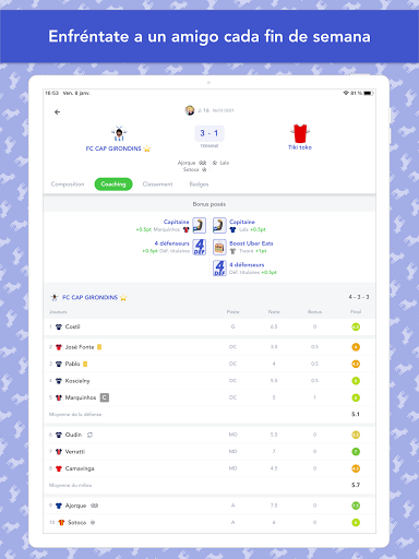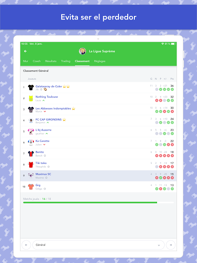 Olvídate del aburrimiento de picas y puntos. Dentro de tu liga privada te enfrentarás a un un amigo diferente cada fin de semana. Ganas si tus jugadores marcan o tienen una puntuación buena, basado en un algoritmo con 80 stadísticas diferentes.