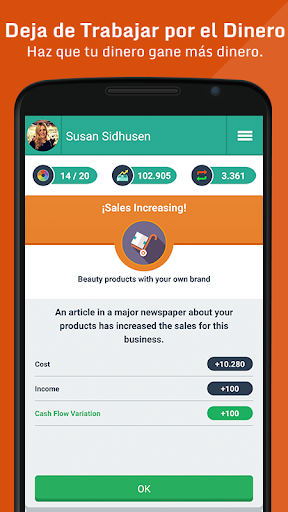 Lleva tus finanzas y administración de dinero al siguiente nivel: toma decisiones de inversión y participa en múltiples oportunidades de negocio. Adquiere y construye negocios y bienes raíces, haz dinero en el mercado de acciones, obtén deudas que te harán ganar más dinero, incrementa tu cashflow y construye ingresos pasivos.