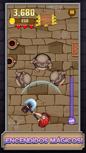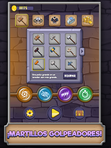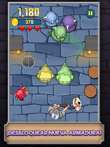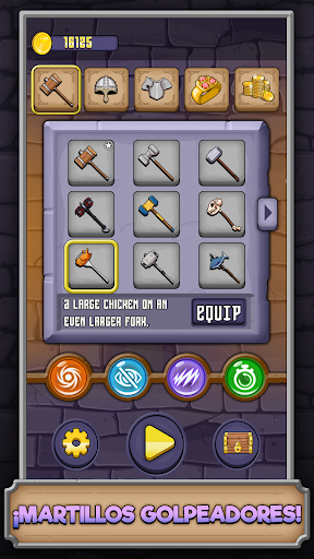 Equipa tu armadura, escoge tu arma, y entra en la mazmorra! ¡ La simple jugabilidad de un solo toque te permite golpear tu martillo y aplastar monstruos, ganar monedas y obtener botines en el camino. Golpea a los enemigos entre sí o hazlos rebotar contra objetos para provocar muertes en cadena. Desbloquea nuevos poderes especiales para adentrarte más profundamente en la mazmorra y alcanzar nuevas puntuaciones. ¡Abre los cofres de tesoros al finalizar tu recorrido y obtiene así más elementos para jugar en la mazmorra con estilo!