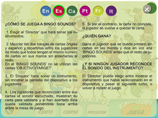 Esta app educativa ha sido concebida con el objetivo de enseñar a los niños en las primeras edades (a partir de 5 años) los instrumentos musicales. Para ello, combina juegos de cartas y contenido digital, que incluye los términos en Inglés, Español, Francés, Catalán, Portugués e Italiano y los sonidos representados en las cartas. Así, los usuarios pueden asociar cada término con su sonido e imagen.