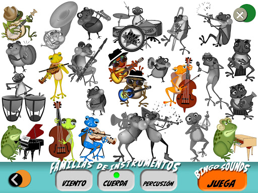 Contiene los nombres y los sonidos de los instrumentos musicales, clasificados por familias (vientos, cuerdas, percusiones).