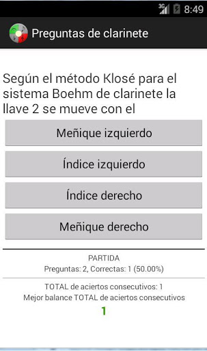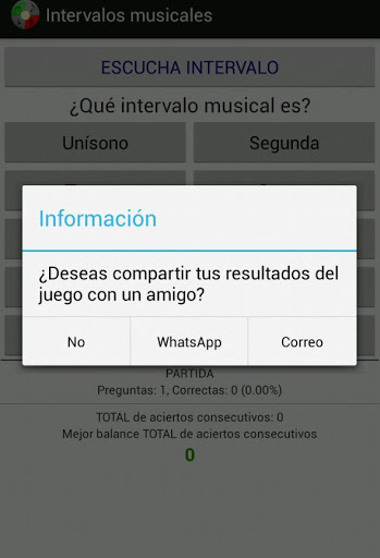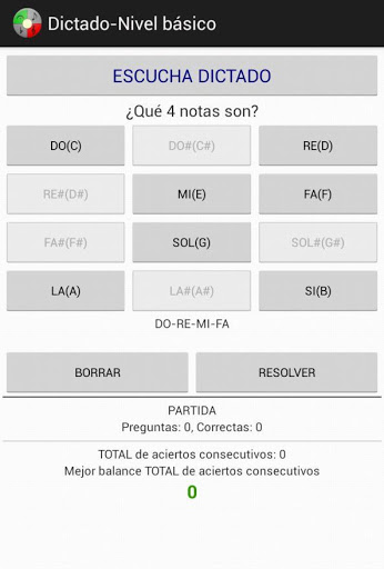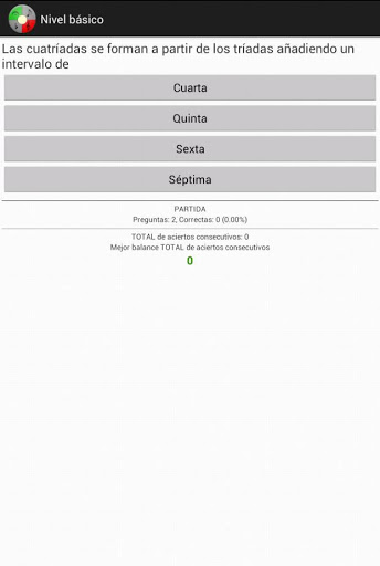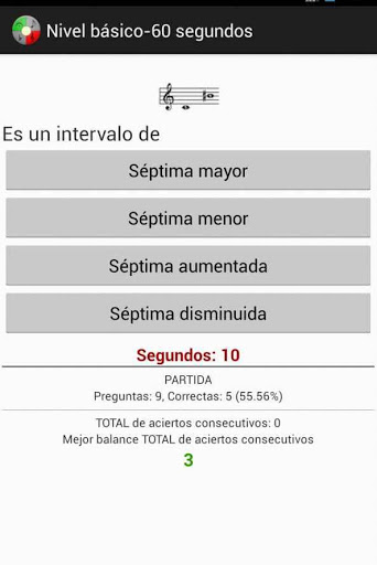 1300 Preguntas en el nivel básico, está enfocado para niños, principiantes e iniciados en la música (aunque también contiene preguntas para todos los niveles). En el nivel Preguntas-60 segundos dispones de un minuto para resolver las cuestiones formuladas. El juego consiste en intentar resolver 10 preguntas en cada partida jugada. Los aciertos y porcentajes se van contabilizando por partida. También se guarda la marca actual de aciertos consecutivos y la mejor marca de aciertos consecutivos sin error en el total de partidas. Podrás enviar los resultados de tus partidas a tus contactos mediante correo electrónico o WhatsApp.