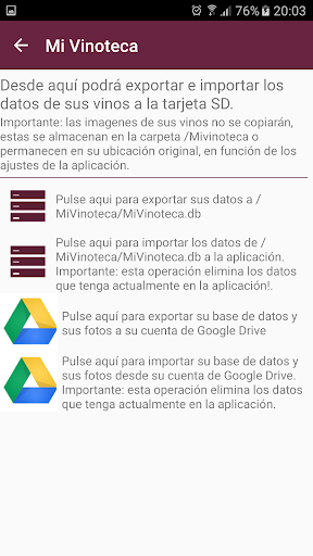 Otras opciones de Mi Vinoteca son exportar e importar tu lista de vinos a tu cuenta de Google Drive, exportar tu lista de vinos a un ficher csv, importar un fichero csv, compartir en Facebok, ver las estadisticas de tu vinoteca...