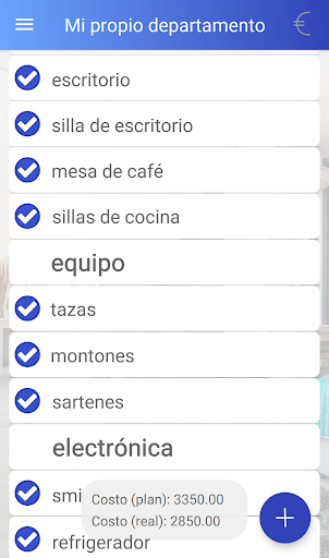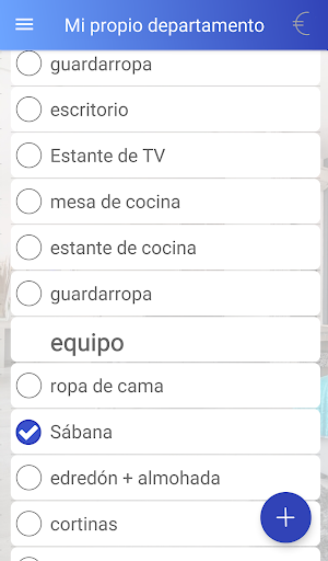 Una lista de comprobación predefinida le muestra todos los muebles, aparatos electrónicos, etc. que necesitará en su propio apartamento. Y puedes completar esta lista con tus propias cosas y categorías.